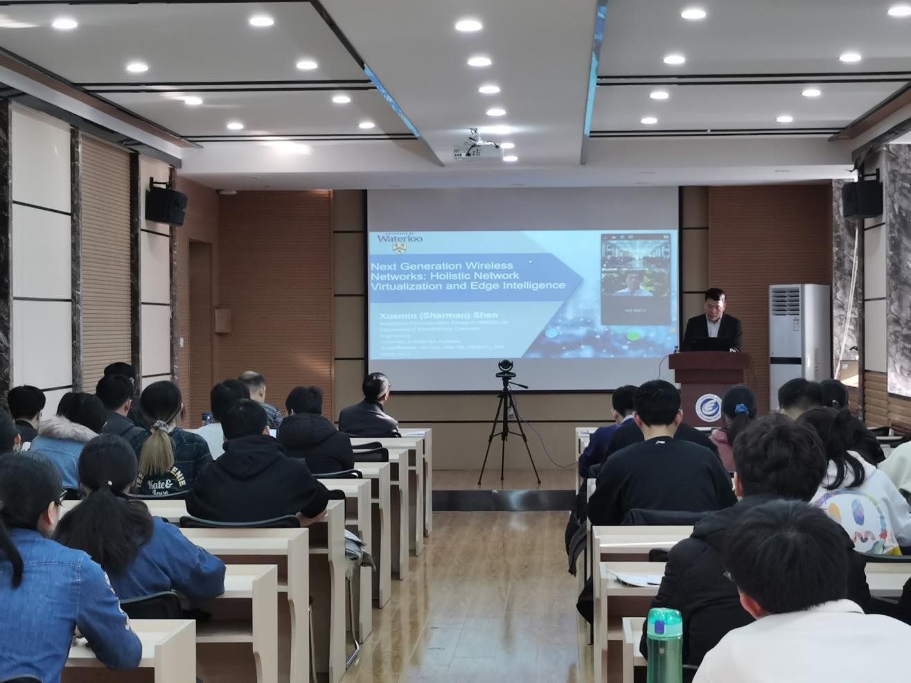 发展的支持,并对日后专家到访和开展合作交流表示期待。Xuemin Shen教授做了题为 "Next Generation Wireless Networks: Holistic Network Virtualization and Edge Intelligence" 的学术报告。他从数字孪生网络和边缘计算、下一代扩展网络构架设计以及AI驱动网络管理这三个方面对6G无线智能网络提出要求,同时总结了下一代网络应具有更加智能和灵活的资源分配策略、可扩展的网络构架和自动网络管理的功能。