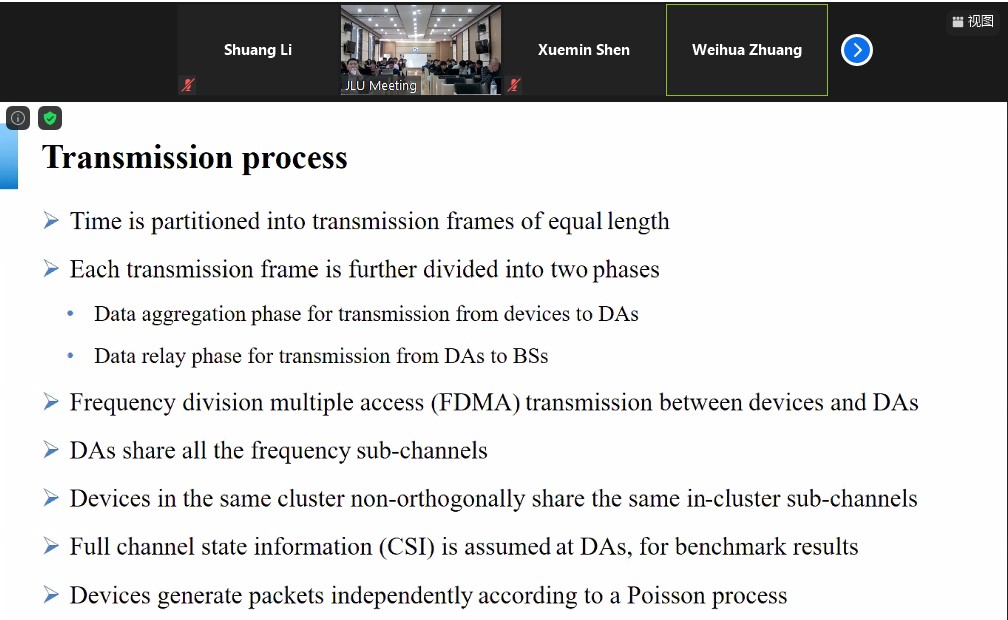 Weihua Zhuang教授做了题为 "Channel Access Management for Cellular IoT Applications" 的学术报告。该报告主要针对物联网的信道切入管理,并全方面介绍了随机信道切入与限制、2跳非正交传输机制以及相关数据优化,同时运用仿真表明所提出的信道切入方案能够减少成本效益。