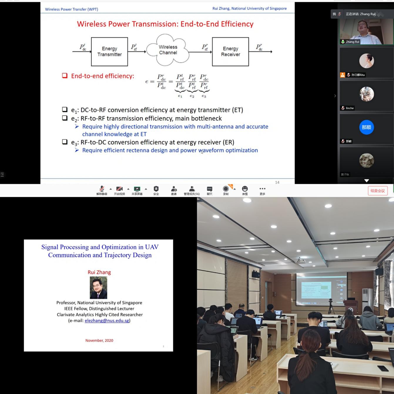 张瑞教授分别于16日,18日,20日进行了题为 "Towards Smart and Reconfigurable Radio Environment: Intelligent Reflecting Surface Aided Wireless Communication", "Signal Processing and Optimization in UAV Communication and Trajectory Design", "Wireless Power Transfer Meets Communication: An Overview" 的学术报告。