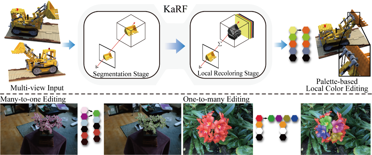 论文概述:近年来,神经辐射场(NeRFs)技术在三维色彩编辑领域展现出巨大潜力。然而,现有基于NeRF的编辑方法仍面临局部区域编辑的重大挑战,通常会导致局部物体边界不精确、多视角一致性难以保持,以及过度依赖标注数据等问题。针对这些局限性,本文提出了一种新型弱监督局部色彩编辑方法KaRF,能够实现三维场景任意区域的高保真度真实感外观编辑。该方法的核心理念是基于柯尔莫哥洛夫-阿诺德网络(KANs)构建统一的两阶段辐射场框架,包含分割阶段与局部重着色阶段。该架构无缝集成NeRF的几何先验知识以实现弱监督学习,从而获得卓越性能。具体而言,KaRF提出了残差自适应门控KAN结构,通过融合残差连接、自适应参数和门控机制,有效提升分割精度并优化特定编辑效果。此外,KaRF提出基于调色板的色彩自适应损失函数,可显著提升加法混合结果的准确性。大量实验表明,所提出的KaRF算法在定性和定量评估上均显著优于多种现有最先进方法。